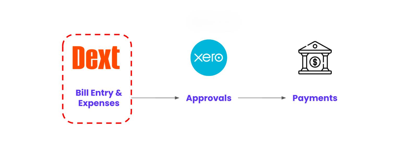 The Dext and Xero payment workflow involves bill and expense data moving from the Dext platform, to approvals which occur on Xero, finally resulting in the payment being made.