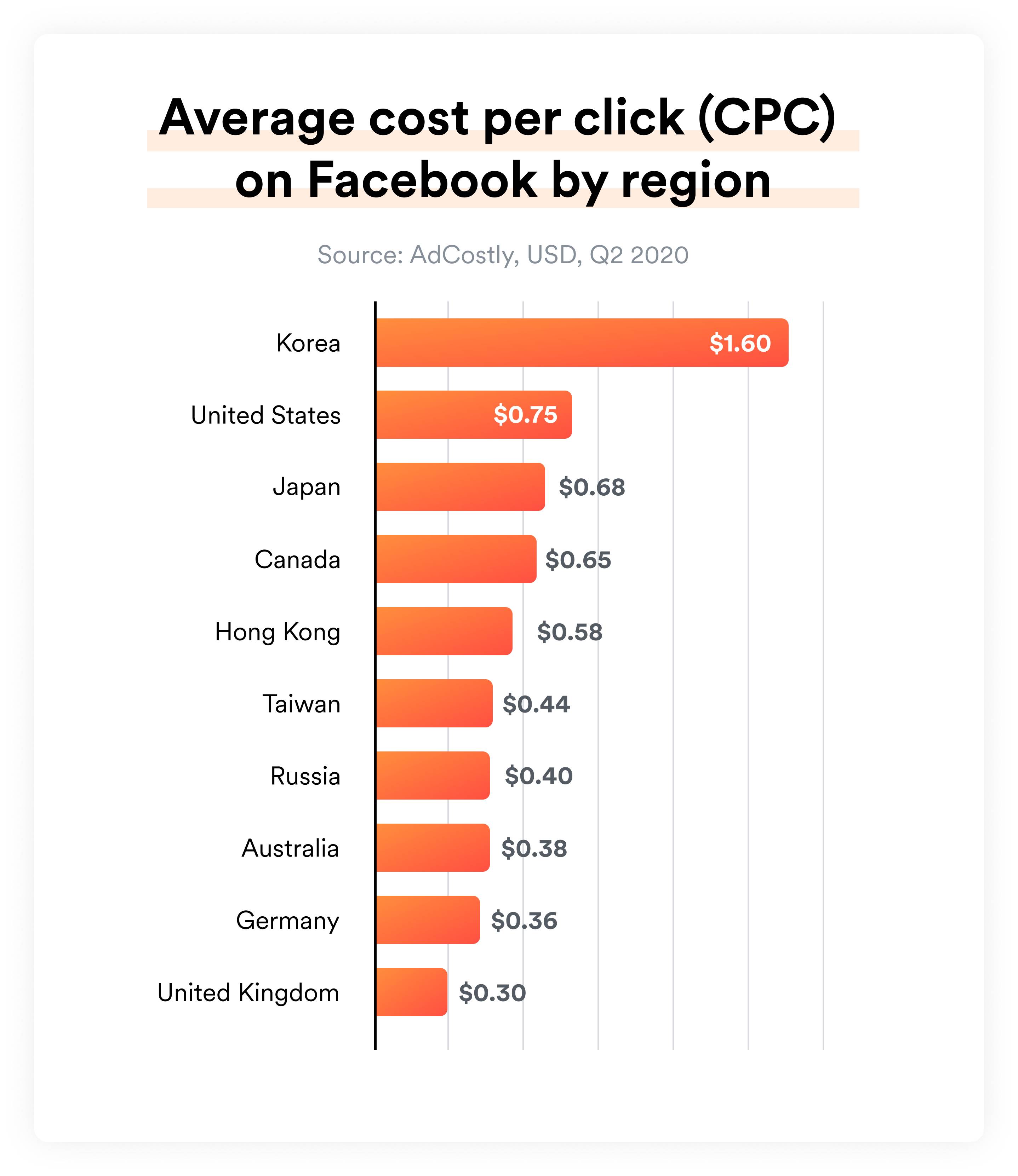Here are the average CPCs for Facebook by country, with the United Kingdom, Spain, and the United States as the three most expensive CPCs.