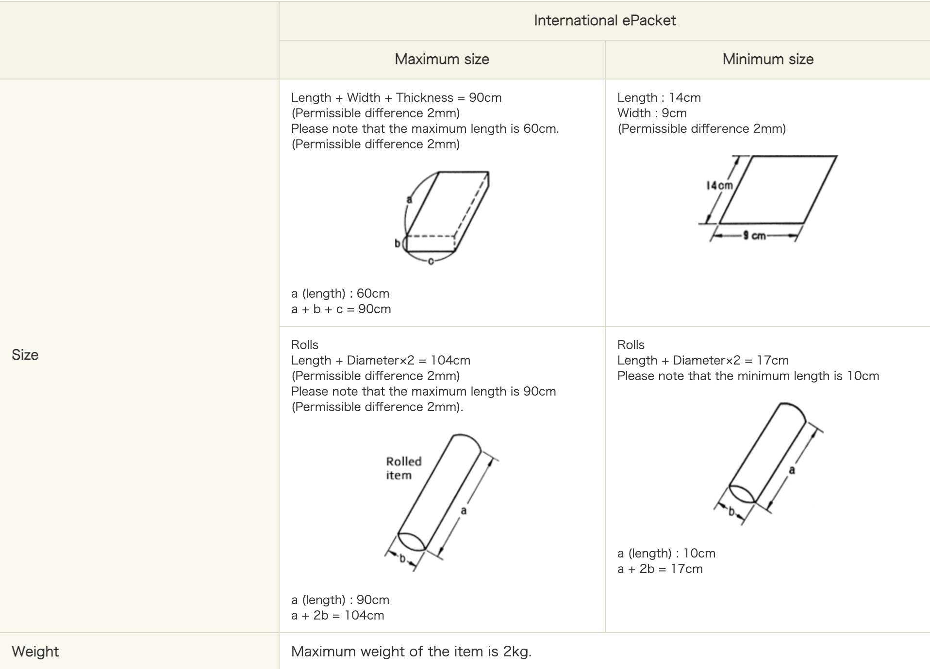 If you’re sending a rolled package (things like cloth samples or posters), different dimensions apply.