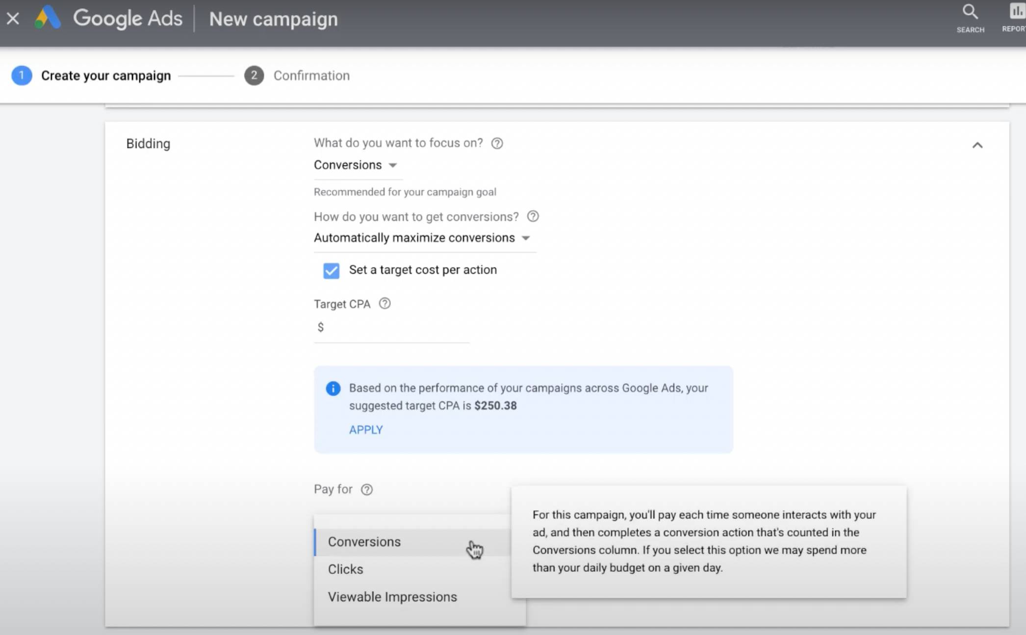 Google has strict criteria when it comes to Pay for Conversions, because they don’t want to lose money on low-performing ads. If you’re eligible, you’ll see an option to pay by conversion when you reach the ‘bidding’ section when setting up your display campaign.