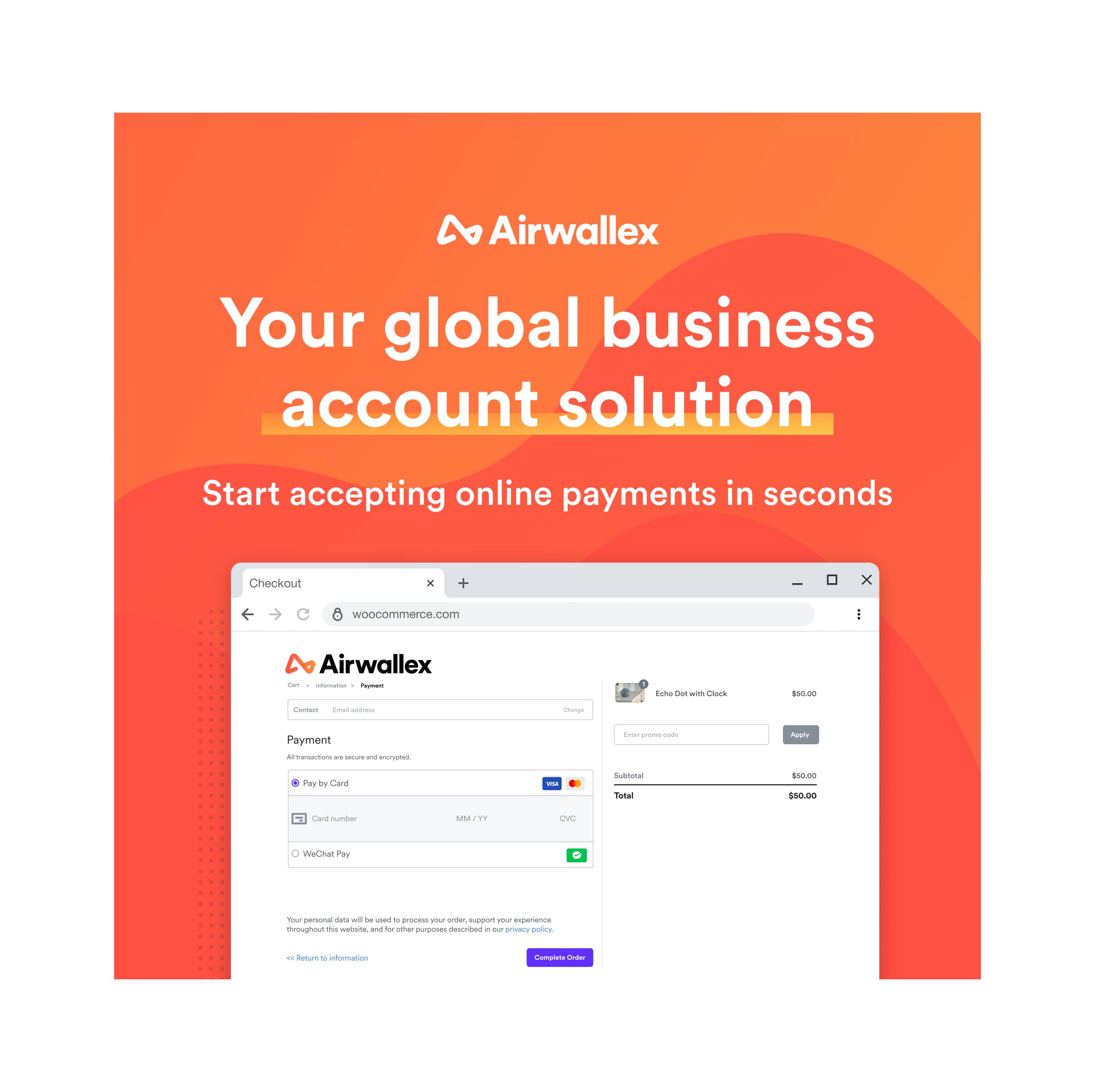 A hosted payments page, which provides a seamless one-click experience that takes your customers directly to your Airwallex-hosted checkout page.