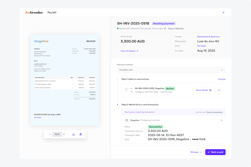 Finance teams can now pay vendor bills directly using Airwallex company cards within Bills, Vendors, and POs — improving control, visibility and cashflow. Create or link company cards in Vendor and PO contexts, or generate a single-use card directly for a bill. Bills are automatically marked as paid when a matching card transaction is found, streamlining reconciliation and enhancing spend tracking.