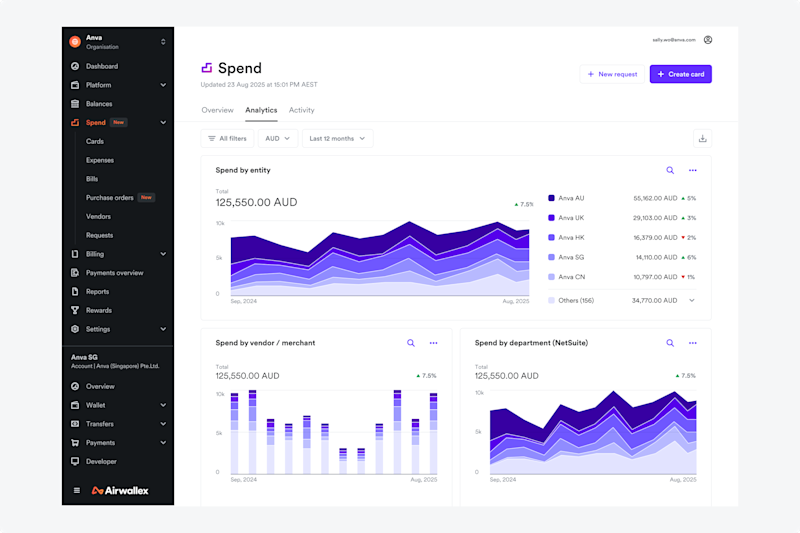 Spend Overview is the new home for managing spend in Airwallex. Quickly see how much you’re spending, what you’re spending on, and who’s spending over time to make better financial decisions and run your business more efficiently. As part of this rollout, you’ll also see a new Spend folder in the left navigation.