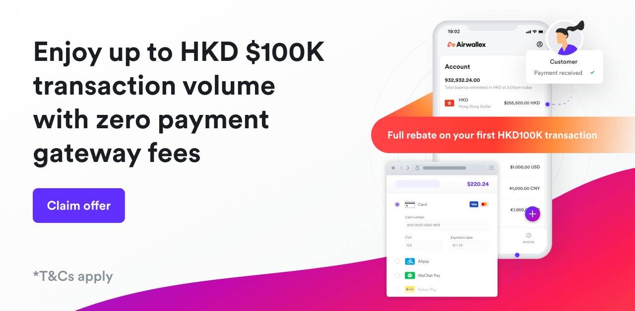 To help you take advantage of the ever-expanding eCommerce market in Hong Kong, Airwallex is offering up to HKD $100K transaction volume with zero payment gateway fees for your online business, so you can earn back your profit margin.