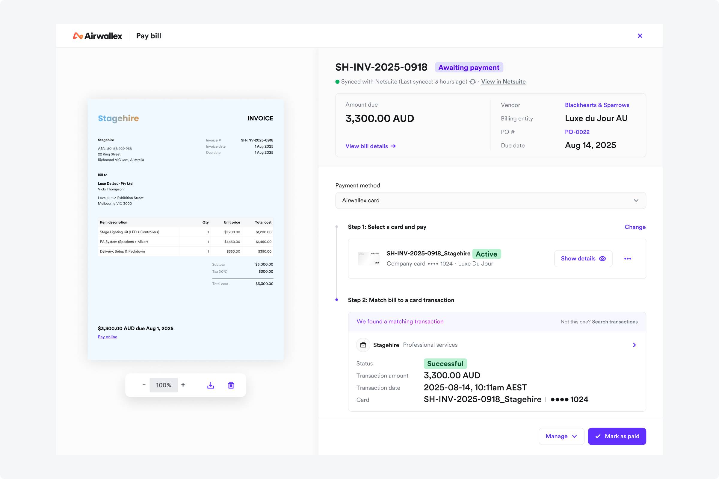 Finance teams can now pay vendor bills directly using Airwallex company cards within Bills, Vendors, and POs — improving control, visibility, and cash flow. Create or link company cards in Vendor and PO contexts, or generate a single-use card directly for a bill. Bills are automatically marked as paid when a matching card transaction is found, streamlining reconciliation and enhancing spend tracking.