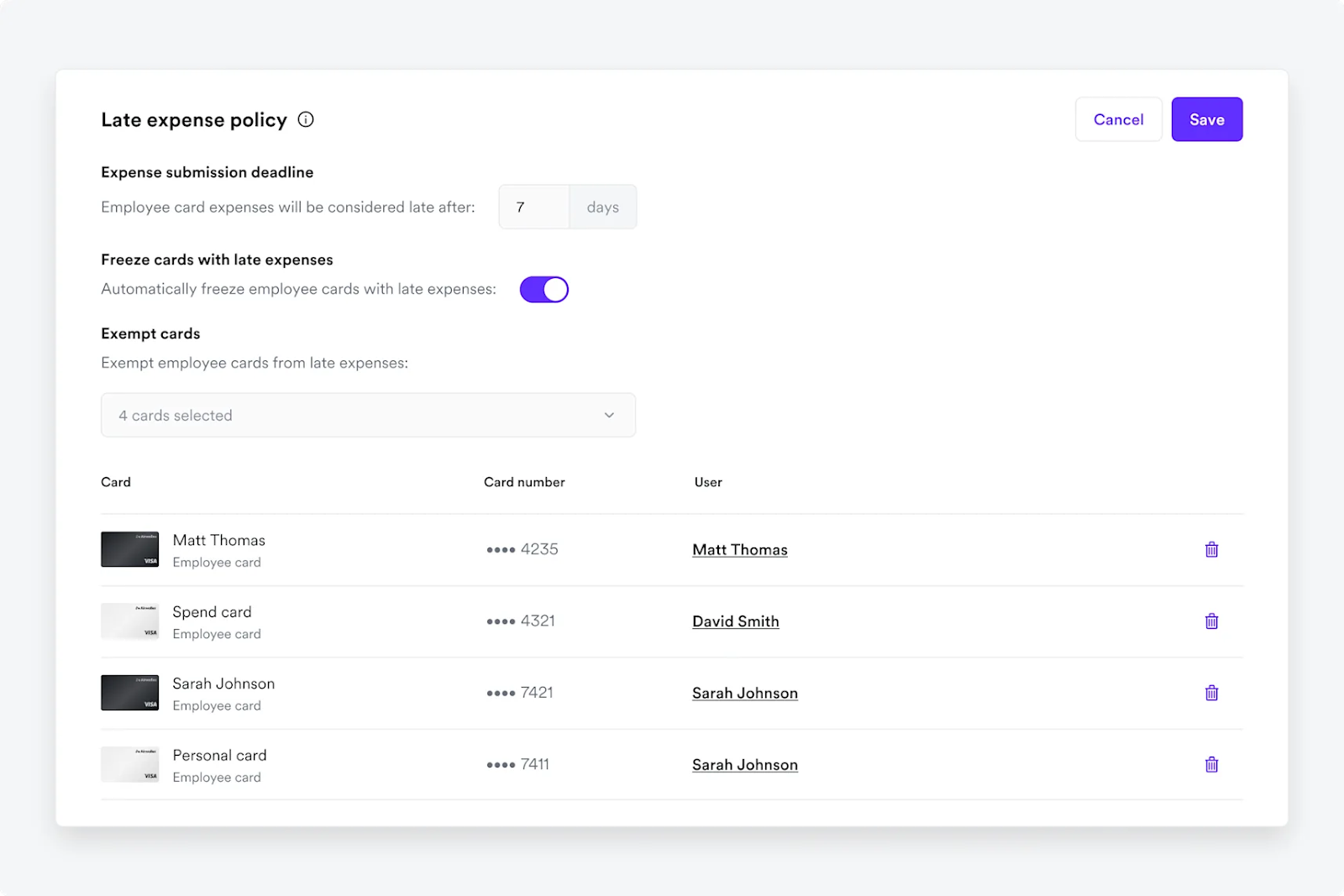 逾期自动冻卡: 若启用了“冻结卡片”设置,任何违反报销截止日期的员工卡片将被自动冻结。一旦员工提交了相关逾期报销,卡片将立即自动解冻。(该选项默认为关闭状态,启用此功能需一定的权限等级)