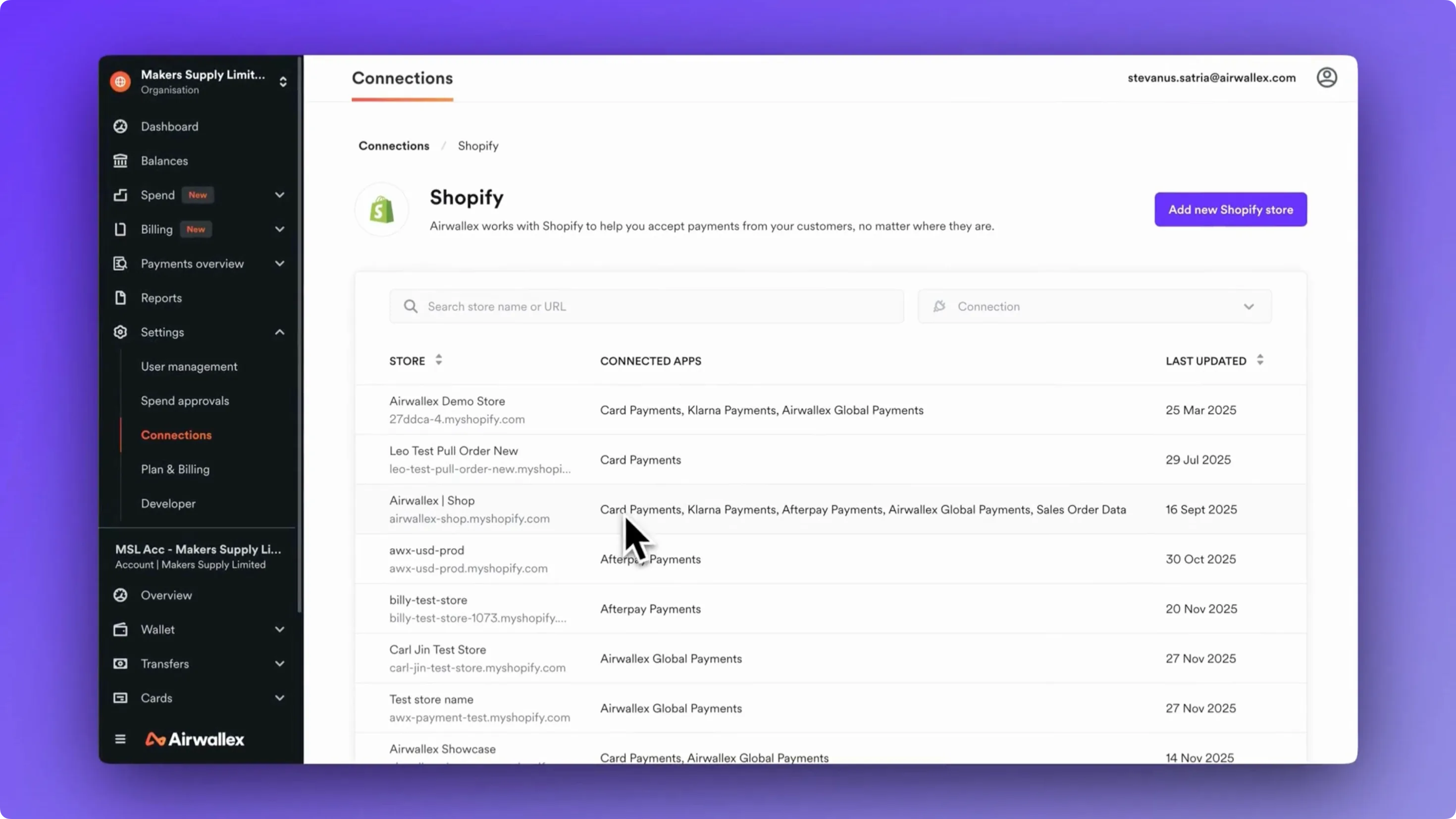 立即注册好消息!Shopify 插件新功能现已登陆 Airwallex 空中云汇网页端应用(WebApp),商家无需切换平台,即可在网页端应用的关联(Connections)标签页,直接统筹管理所有 Shopify 关联配置,操作便捷度再升级!