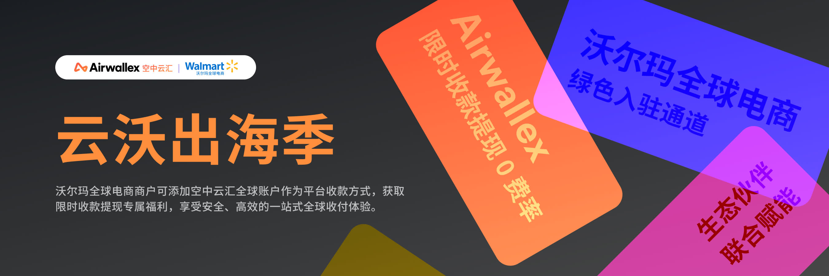 为更好地助力出海商家赢在沃尔玛全球电商,Airwallex空中云汇推出“云沃出海季”限时福利活动。2024年3月1日起至2024年6月30日,活动期间注册并激活Airwallex空中云汇账户的新用户,在绑定沃尔玛全球电商账户后,可体验120天收款提现0费率的限时优惠。