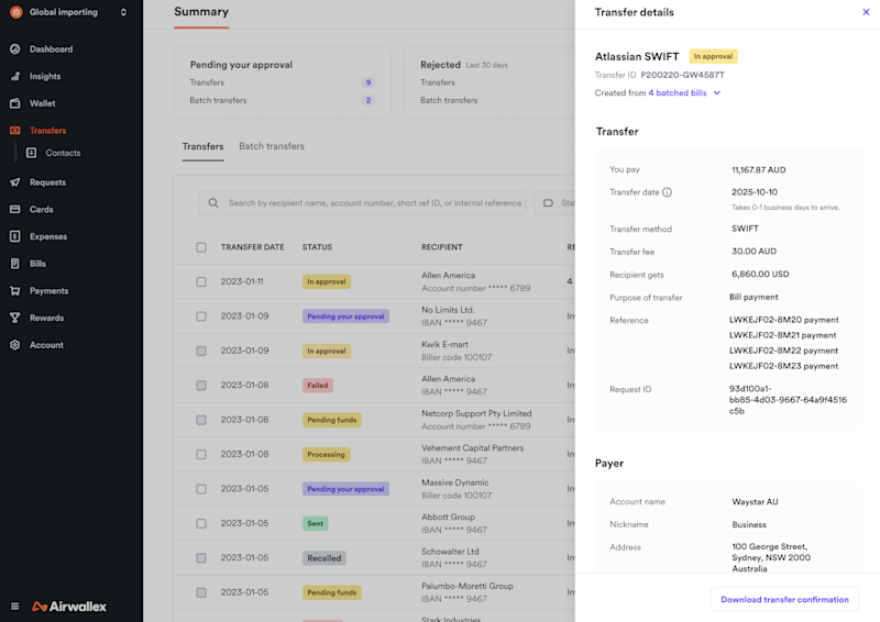 更高效的流程:Airwallex 会自动识别并提示可合并支付的账单,优化付款流程,企业用户可随时取消账单合并,一切尽在掌控。
