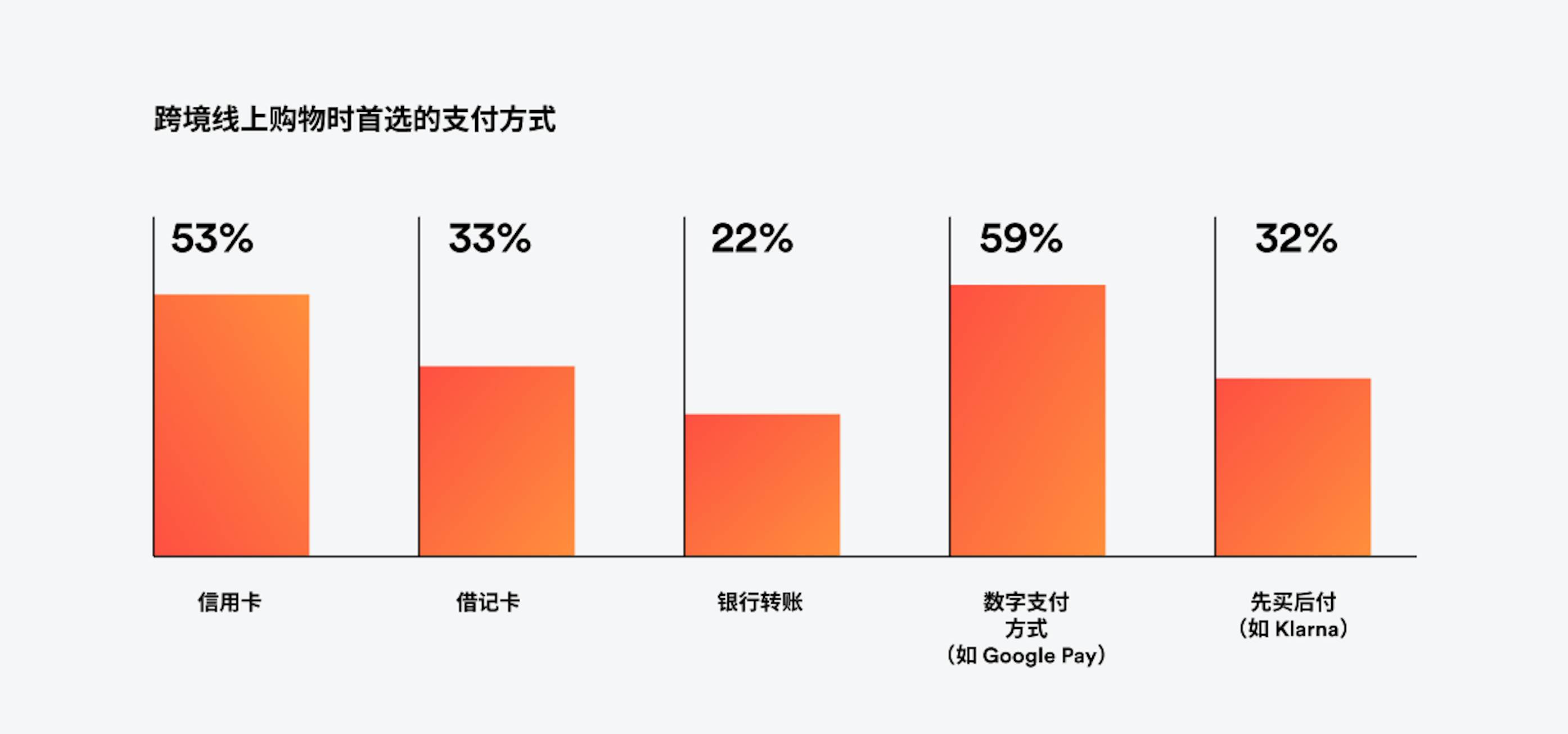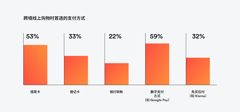 当前,全球消费者使用的支付方式日益增多,信用卡、借记卡、数字钱包、银行转账、先买后付等,越来越多的支付方式也令挑战愈发复杂。如今,数字支付(如 Apple Pay 和 PayPal)几乎已成为全球通用的支付方式,59% 的全球消费者常使用这些方式进行线上购物。