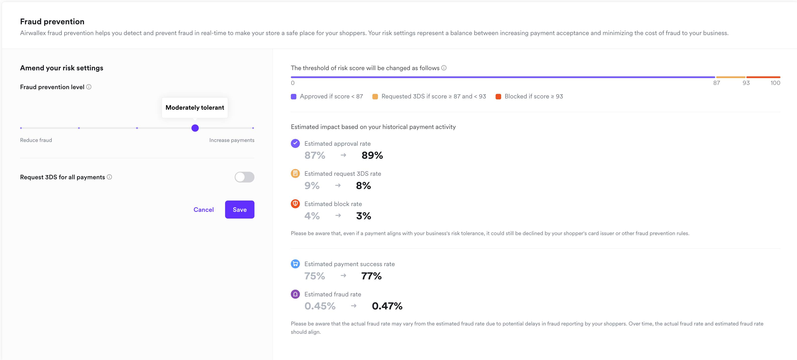 Airwallex 提供默认的推荐风控阈值,商户可结合自身情况灵活调整。例如,高客单价的商户可使用更加严格的风险设置,避免高昂的单次欺诈成本。低客单价的商户,优先考虑转化,可采用更宽松的风险设置,减少3DS触发,提升客户的购物体验。