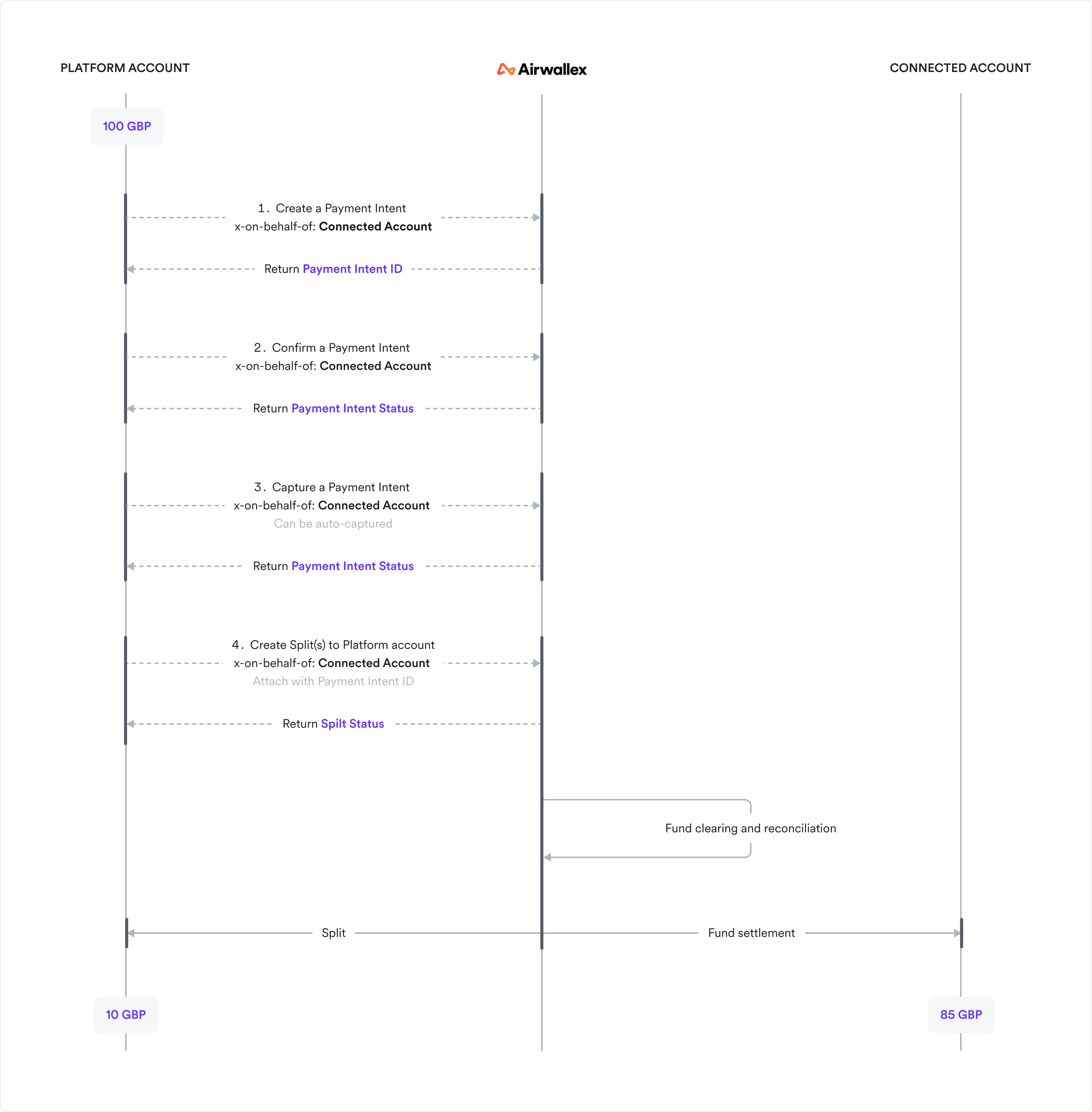 FundsSplitwith 10 GBP on behalf of connected account, where thesource_idequals topayment_intent_id, anddestinationequals to platform account’s ownaccount_id. Platform can usemetadatato record values that help better recognition of each splitShell1curl -X POST https://api-demo.airwallex.com/api/v1/pa/funds_splits/create \2 -H 'Content-Type: application/json' \3 -H 'Authorization: Bearer {{ACCESS_TOKEN}}' \4 -H 'x-on-behalf-of: acct_ad1KMcnQM2Wmo2PFSuvR2g' \5 -d '{6 "request_id": "ee939540-3203-4a2c-9172-89a566485dd9",7 "source_id": "int_e65tkXCSzJrsMpTrzoFrjaau53",8 "source_type": "PAYMENT_INTENT",9 "amount": 10,10 "destination": "acct_ITNg64dHNgihu9rPpWeiMg",11 "metadata": {12 "reason": "commission agreed with seller A"13 }14 }' -