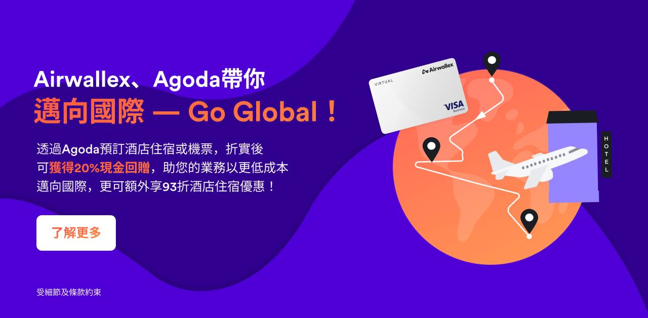參加Go Global,輕鬆計劃商務旅遊 即日起至2022年3月31日,香港中小企可免費申請由Airwallex與Agoda聯手策劃的「Go Global」計劃,尊享一系列優惠及現金回贈獨家優惠,助您更輕鬆預備下一次商務旅遊。