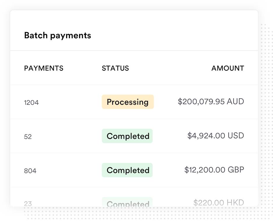 Run international payroll or bulk pay outstanding invoices in minutes. Import a single file and make up to 1,000 payments at a time.