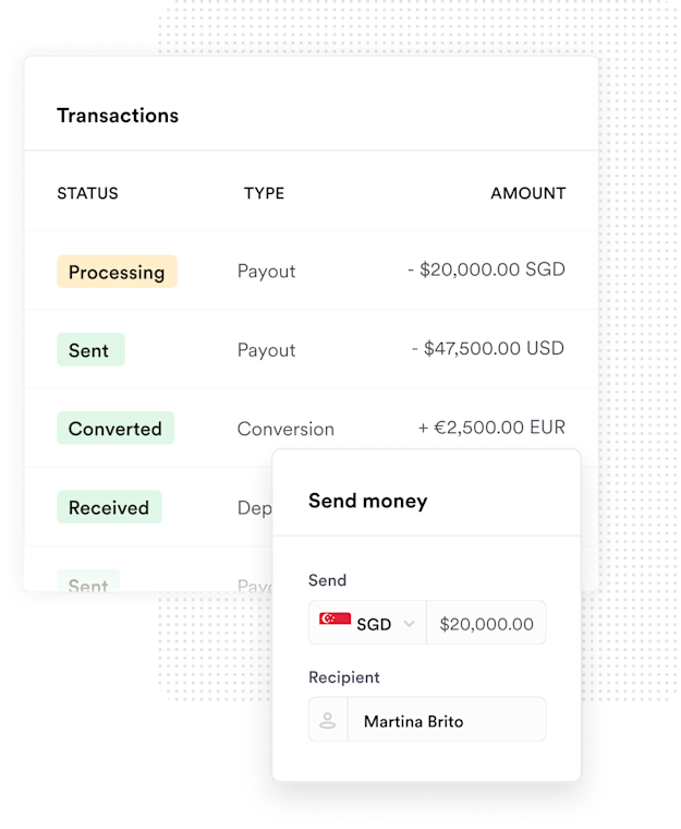 Once you have funds in your Business Account, you can spend them using Airwallex Borderless Cards, or transfer them to your recipient’s bank account. Use your Singapore dollars to pay suppliers and employees in Singapore and elsewhere efficiently, without being subject to needless currency exchange fees.