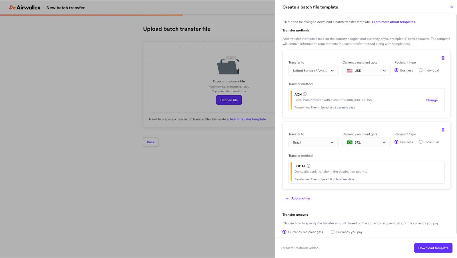 You use a template to fill out details about your recipients, payment destinations, currencies, and preferred payment method. Once you’ve completed the template, you upload it to your payments system and it processes the transfers at scale.