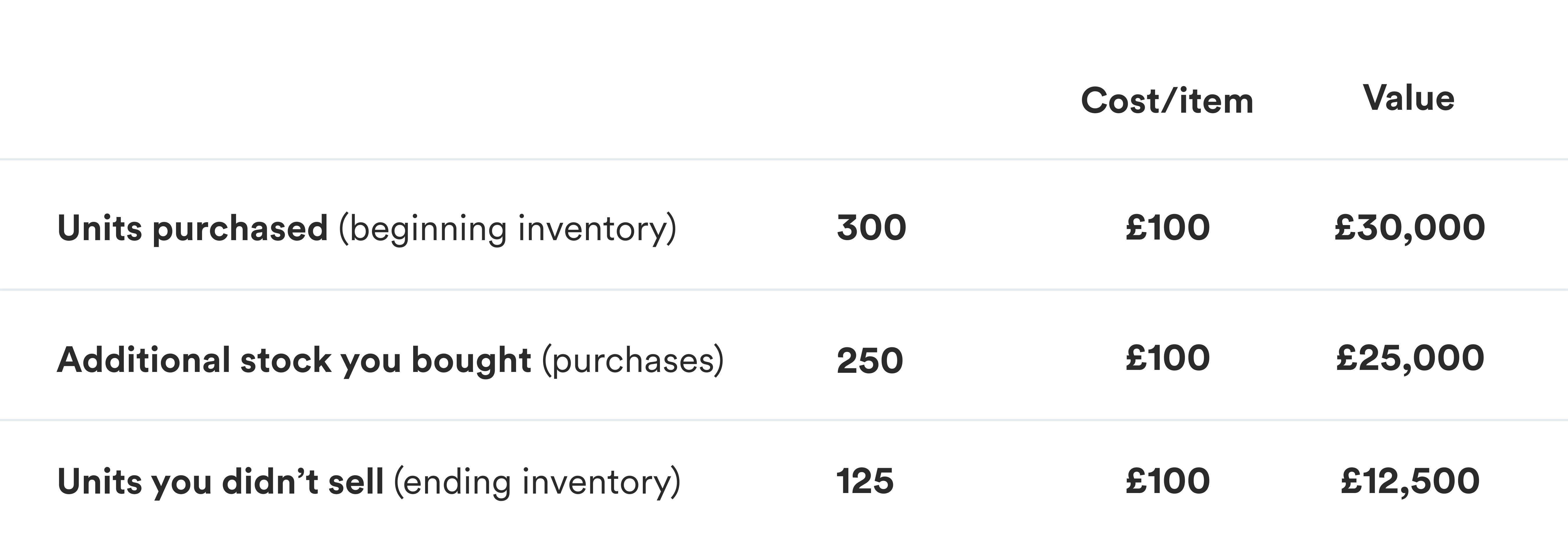 Finally, you need to know how much stock you had at the end of this period. This is your ending inventory, i.e. items you didn’t sell.