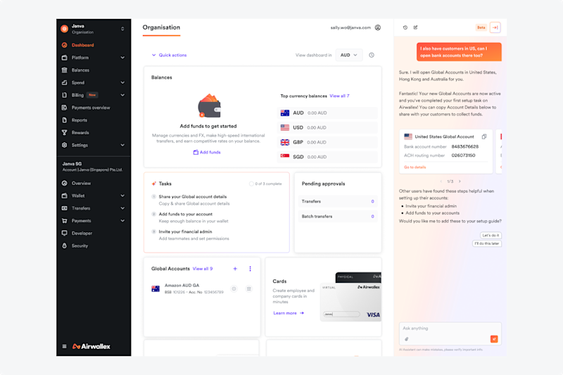 We’re introducing an AI-powered assistant in the Airwallex WebApp to help new customers get up and running quickly. The assistant understands your business context, guides you through onboarding, answers questions in real time, and can perform actions on your behalf – such as opening new Global Accounts or enabling payment methods you want to accept.