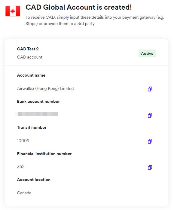 Our modern technology allows you to instantly receive CAD into a dedicated CAD global business account, without the hassle of setting up a local bank account in person.