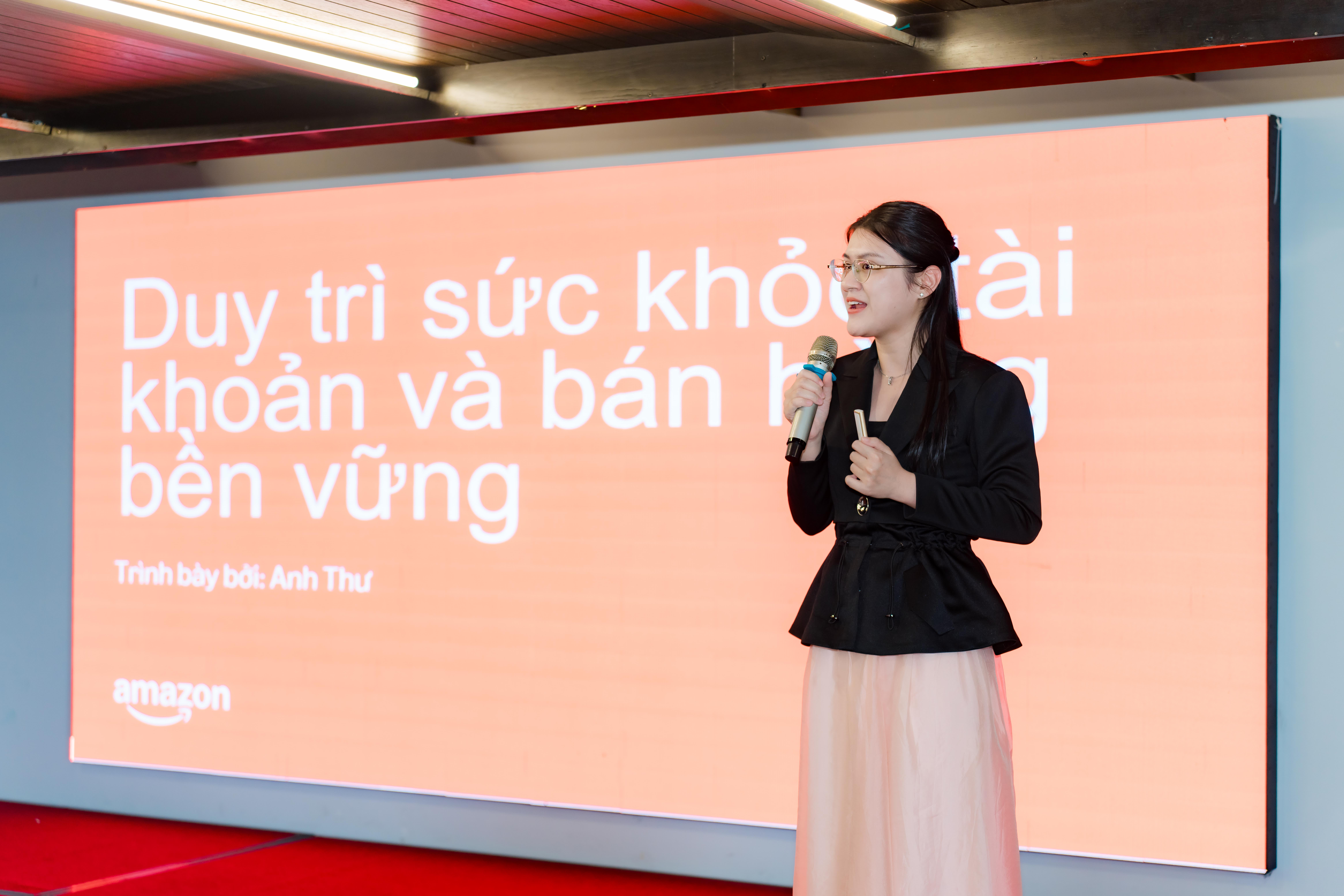 Đại diện Amazon Global Selling Việt Nam, chị Thư Nguyễn - Strategic Account Manager, tập trung vào chủ đề "Sức khoẻ tài khoản", giải thích các chỉ số chính, lỗi thường gặp và những lưu ý quan trọng khi xác minh tài khoản. Phần chia sẻ giúp seller hiểu rõ “vùng đỏ” cần tránh và cách vận hành để tài khoản Amazon an toàn, sẵn sàng mở rộng thêm thị trường.
