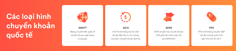 Khi thực hiện giao dịch chuyển tiền quốc tế, có nhiều hệ thống thanh toán khác nhau được sử dụng tùy thuộc vào khu vực và loại tiền tệ2: